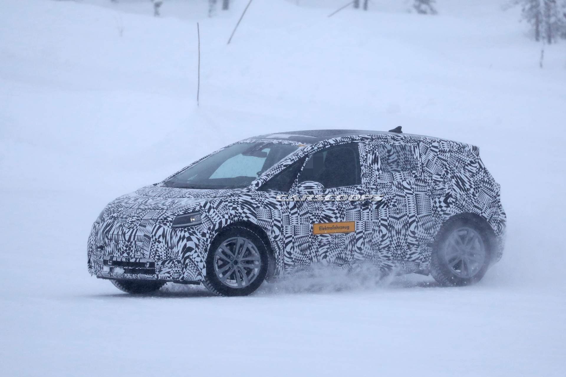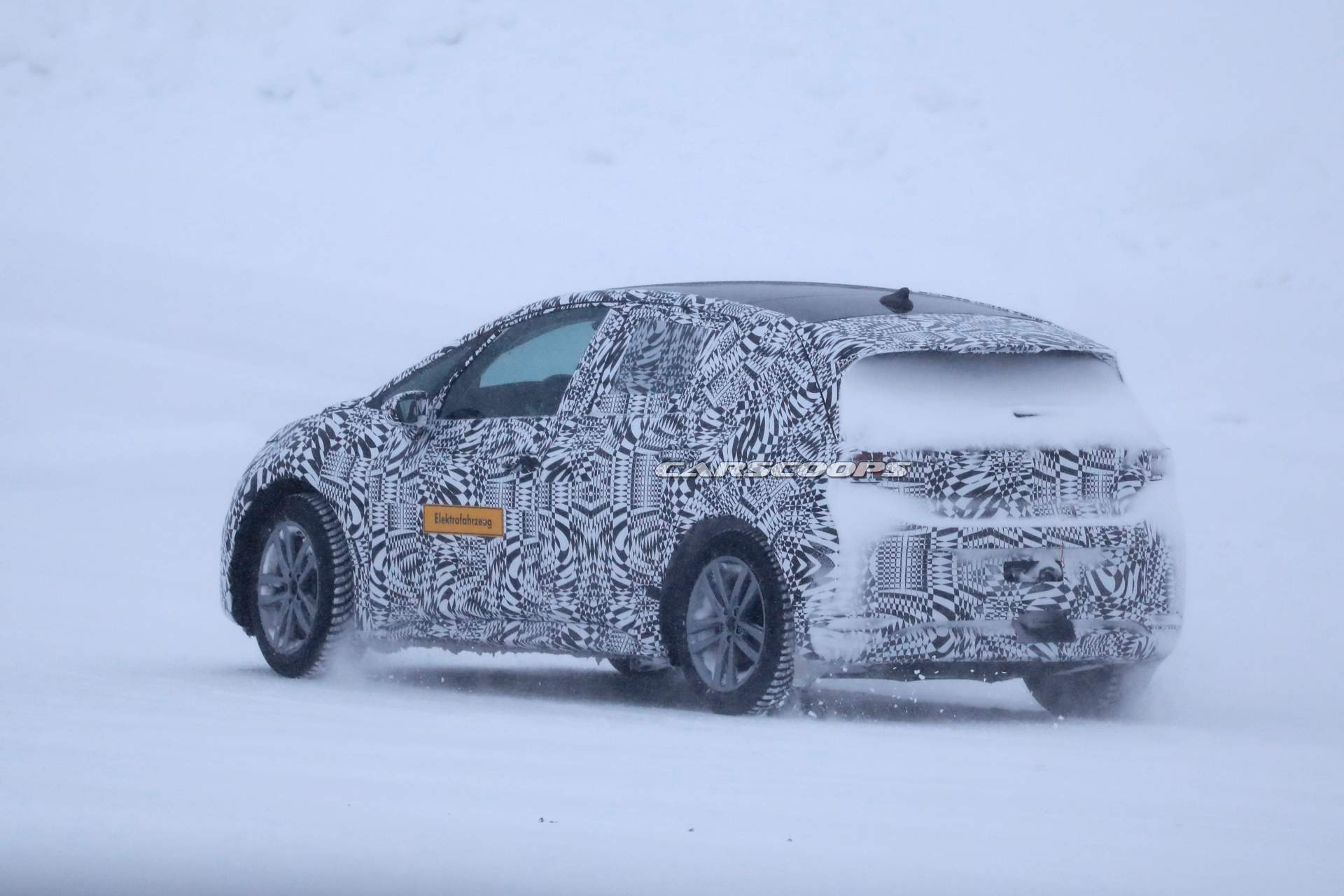 As you can see, the car features an identical camouflage as in the “official spy shots” but it ditches the aero wheels for a set of conventional rims shod with winter tires. There is also an “Elektrofahrzeug” sticker on the front doors — that’s German for “electric vehicle.”