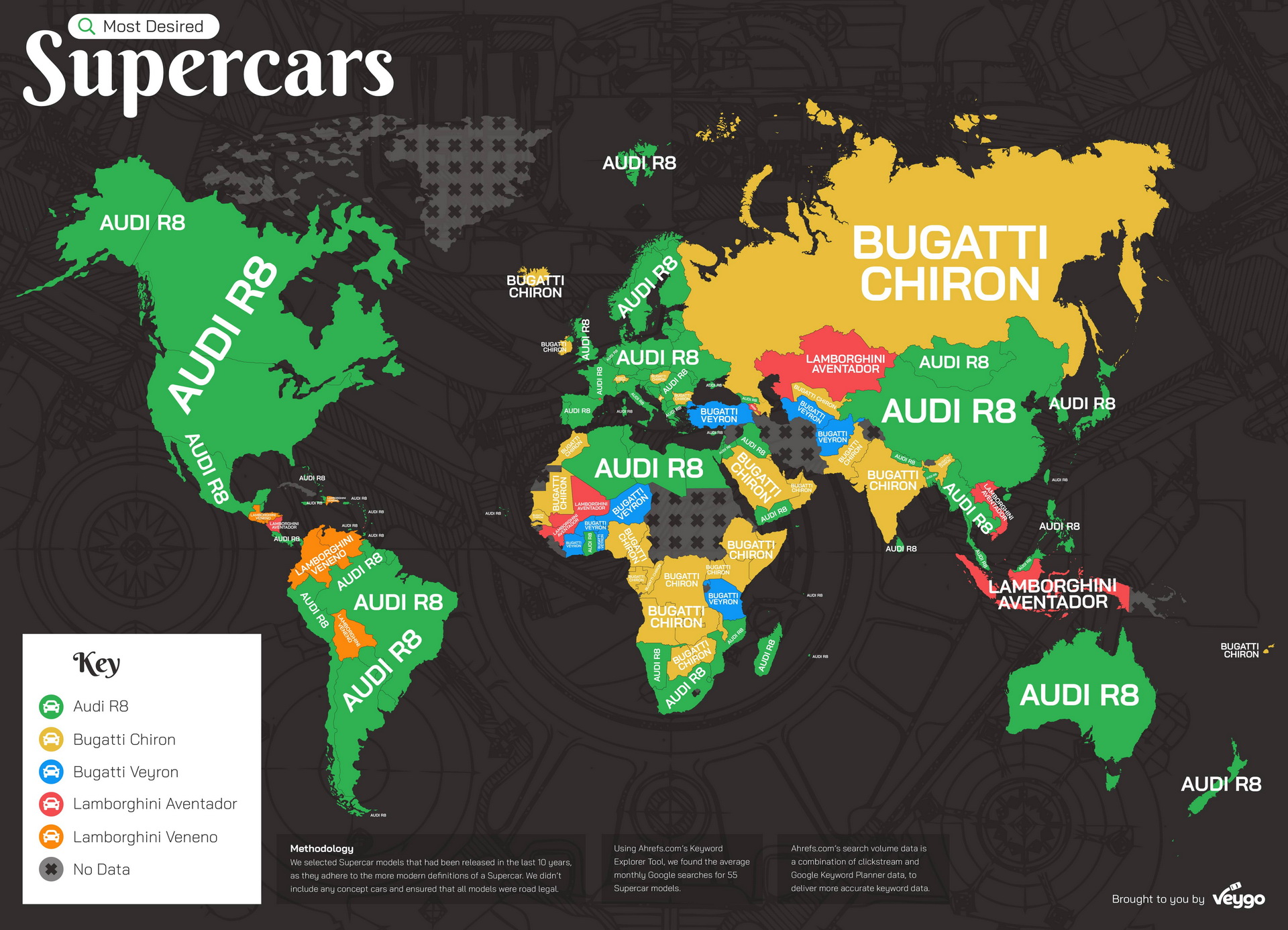 According to Veygo, who looked at supercar models released in the past 10 years and ran all the names through a keyword explorer tool, the nameplate that came out on top in 95 of 169 countries was none other than the Audi R8, edging out the likes of the Bugatti Chiron and Lamborghini Aventador.