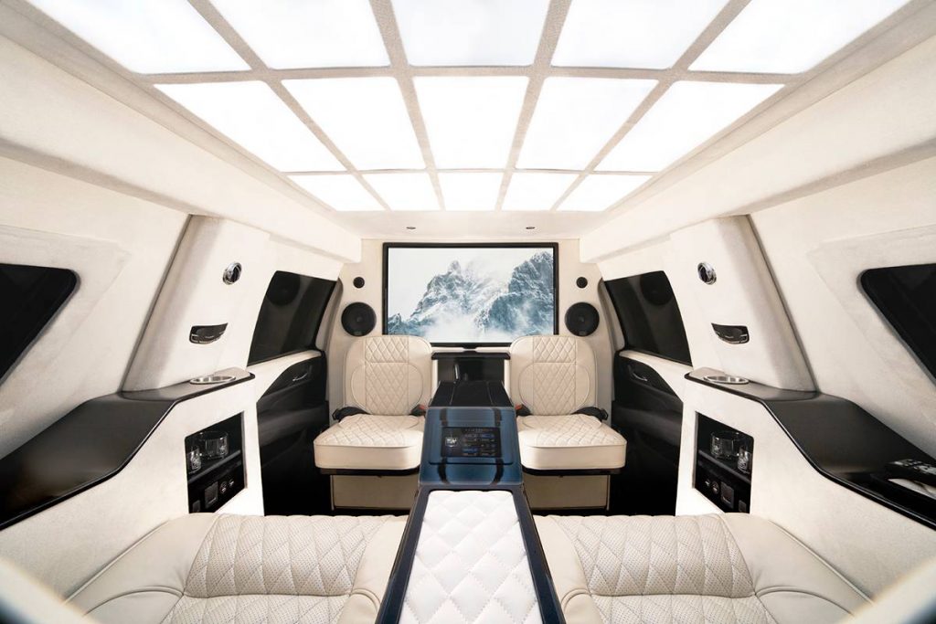 The cabin also features advanced multimedia and audio systems including a 4k Smart TV, 4G LTE hotspot, Apple CarPlay and Android Auto integration and a premium surround sound system. Passengers also benefit from a customized bar, an innovative lighting system, and the discretion made possible by the partition between the rear passengers’ area and the driver. The armored Escalade also comes with its own 360-degree perimeter security CCTV, satellite TV and phone system, a biometric gun safe, and much more.