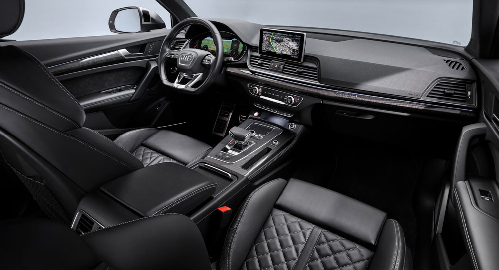 Audi’s new sporty SUV has revised bumpers, a grille with double aluminum slats and contrasting trim elements, and S logos on the outside. It also gets standard LED front and rear lights, dynamic turn signals and an exclusive color called Panther Black.