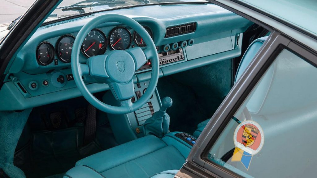 These accents serve as a preview to the 911’s leather upholstered interior which is completely turquoise. Interestingly, the colorful air-cooled Porsche was the company car of Tilman Brodbeck, the assistant to Peter W. Schutz, who was Porsche’s CEO at the time. Mr. Brodbeck used it from early 1984 until summer 1985 and it was during that period that he put his personal mark on the car.