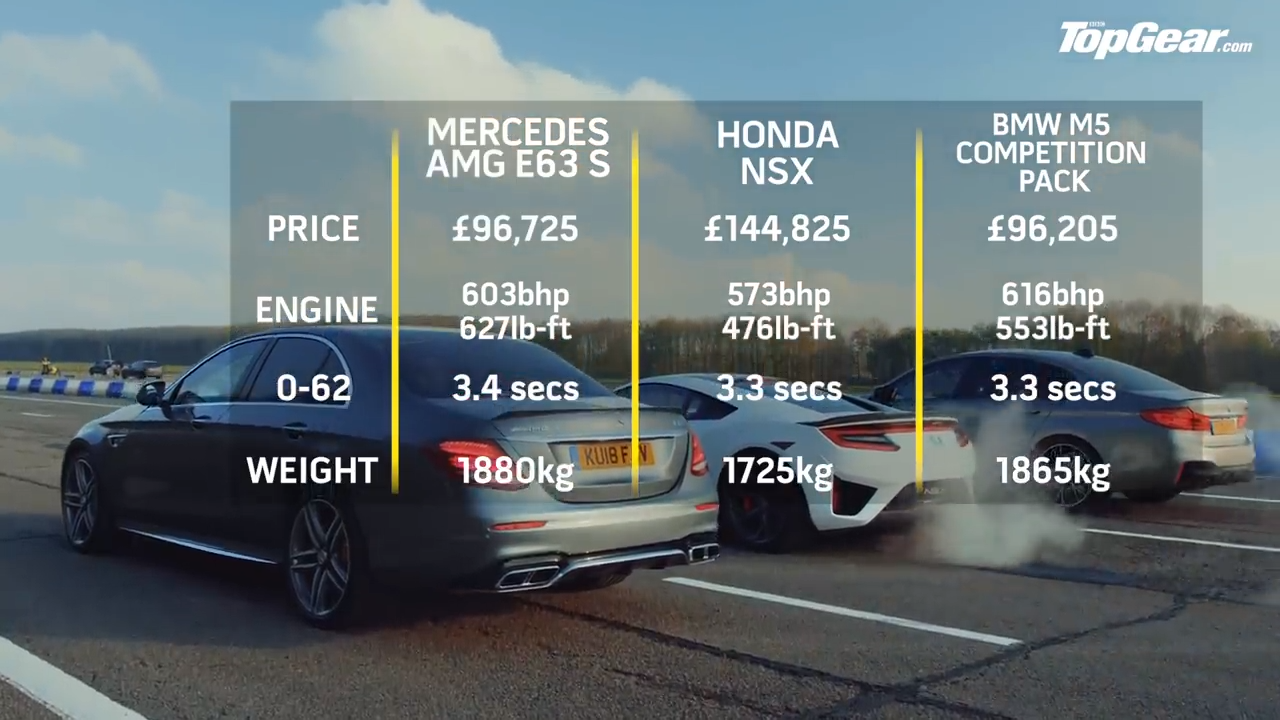 On one side, you have two of the finest performance saloons from Europe, the Mercedes-AMG E63 S and BMW M5 Competition, and on the other, the Honda (Acura in North America) NSX, in a drag race conducted by TopGear’s Rory Reid. The show’s former co-host jumped behind the wheel of the Japanese hybrid supercar, confident that the vehicle will cross the finish line first.