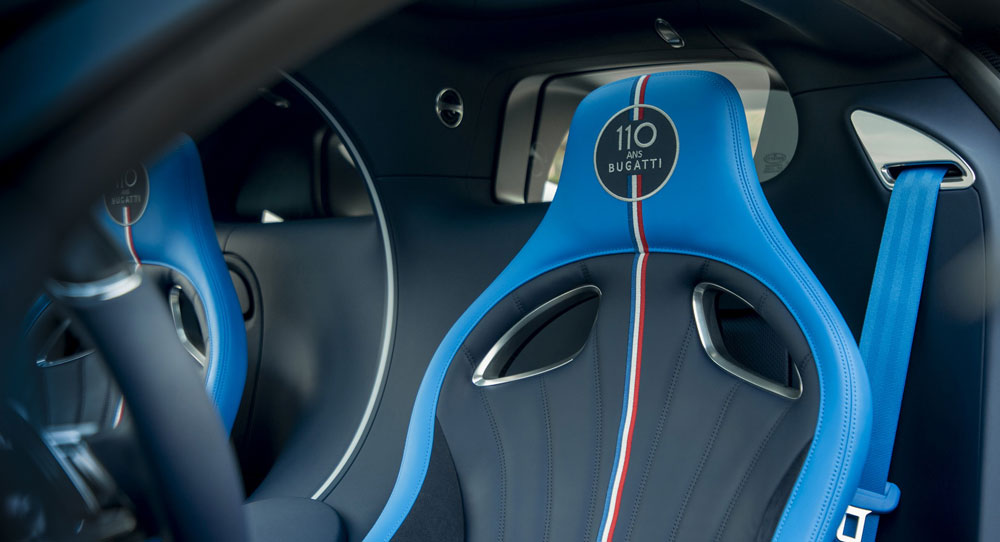 A similar color scheme was chosen for the cockpit, where you’ll find Deep Blue leather upholstery, Alcantara trim, carbon fiber inserts and more ‘red, white and blue’ accents, in addition to the ‘110 Ans Bugatti’ emblem applied to the headrests.