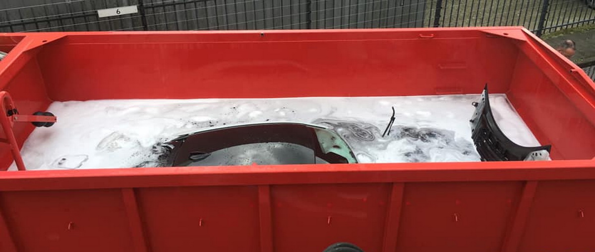 Before dropping the car into the container, firefighters dispersed the larger flames separately. However, since the i8 features lots of electronics and flammable components, they simply couldn’t take any chances, so they had a large container of water delivered.
