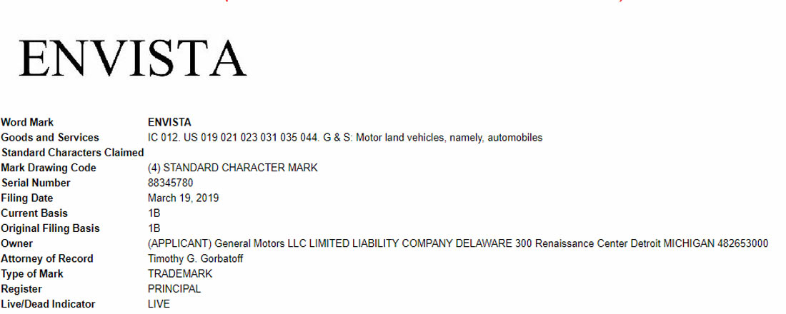 General Motors has applied to trademark the name ‘Envista’ with the United States Patent and Trademark Office (USPTO).