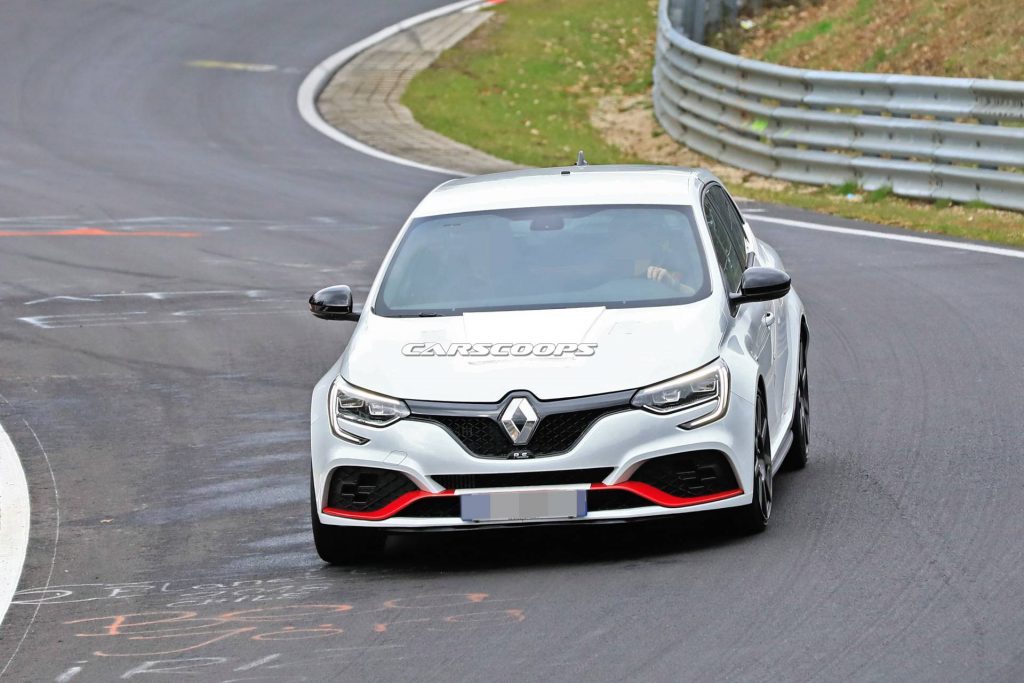 The fact that our photographers spotted it lapping the Nürburgring should come as no surprise to anyone, but the presence of both visible and hidden modifications should. First of all, it features a vented bonnet with a big bump in the middle that may or may not hide a scoop. Then there’s the red wing in the front bumper that reminds us of the previous Megane RS 275 Trophy-R, which also had its wing painted red.