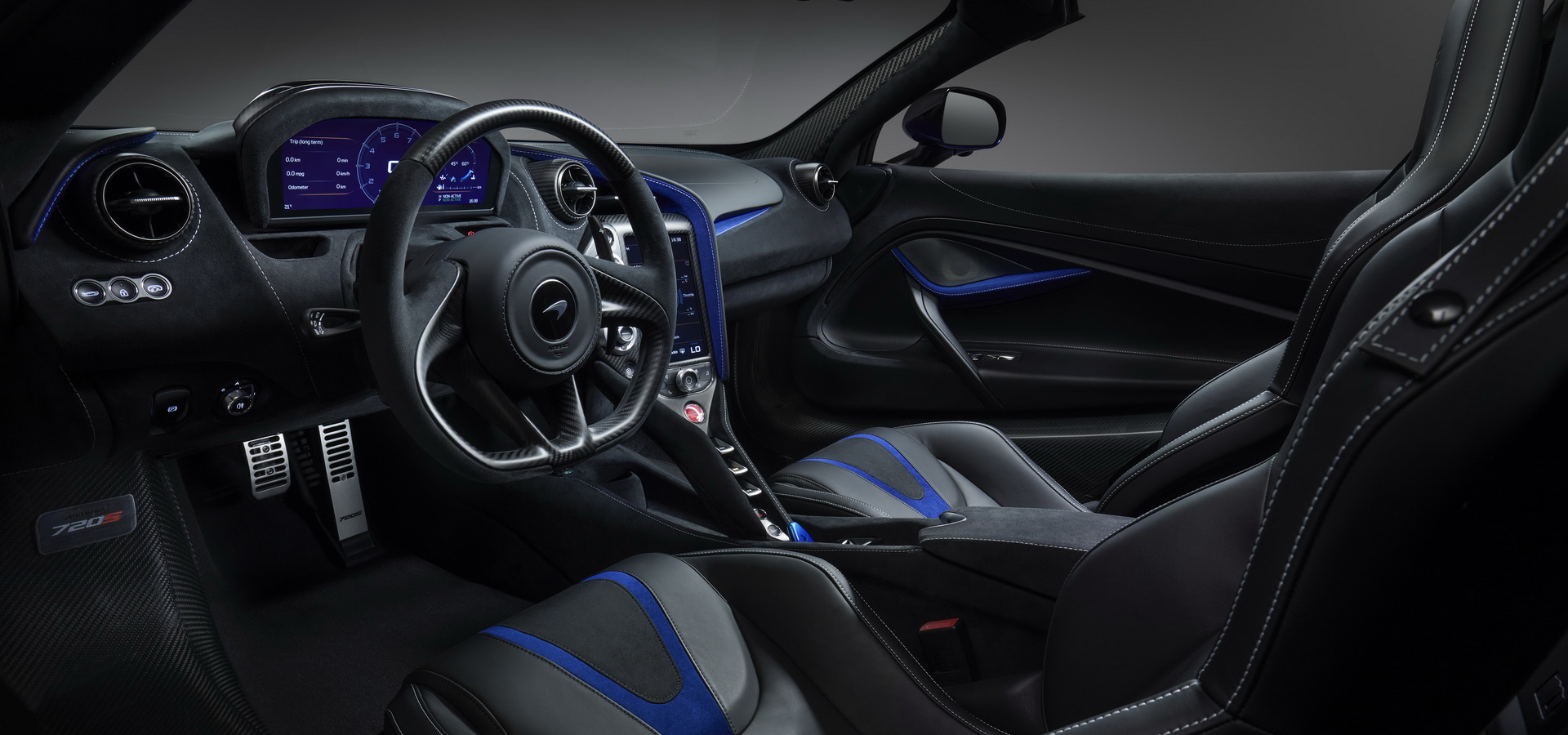 Inside the 720S Spider by MSO you’ll find surfaces trimmed in Burton Blue Alcantara and Jet Black leather. While all primary and secondary interior components are carbon fiber, there’s also the option of exposed Visual Carbon Fiber for the Monocage II-S structure.