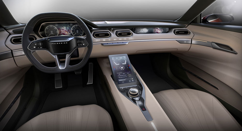 Dedicated to Leonardo DaVinci, the study has been designed as a Gran Turismo with a pure electric drivetrain. It’s capable of housing two electric motors, one on each axle, whereas the batteries are mounted on the floor.