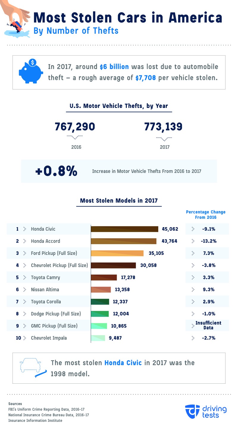 While the Altima is the most popular new car with thieves, the model only ranks 7th on the overall list of most stolen vehicles in 2017. This puts it far behind the Honda Civic (45,062 thefts), Honda Accord (43,764 thefts) and full-size Ford pickups (35,105 thefts).