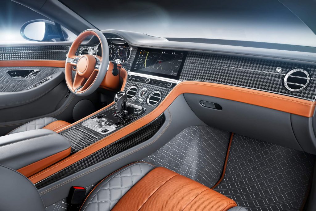 And so we’ve reached the car’s most spectacular part, the interior. The Geneva show car rocks a two-tone cabin combining grey and brown leather — including in the footwells where the Conti GT features stitched quilted leather matching the square upholstery pattern of the seats. Even the floor mats sport the identical design, adding brown leather borders.