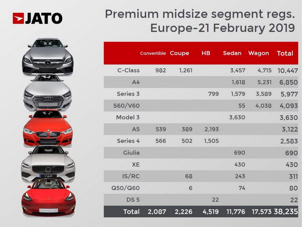 Update #2: Jato backed up its claim that the Tesla Model 3 is the “best-selling premium sedan” in Europe (21 countries) for February. The electric model sold more units than the sedan versions of models like the Audi A4, BMW 3-Series, Mercedes C-Class, but the German models sold overall more examples when you take into consideration their station-wagon, coupe etc. derivatives. Jato sent us a new graph showing the sales numbers of the premium midsize class divided by bodystyle. We have contacted Audi, BMW and Mercedes for a comment, and we’ll update once we hear back.