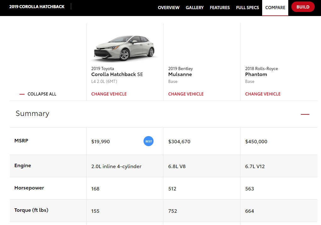 While the model has a lot in common with the 2019 Corolla Hatchback, a redditor recently discovered an interesting quirk in Toyota’s comparison tool. While the site automatically suggests the hatchback be compared with the Hyundai Elantra GT and Honda Accord, users aren’t limited to selecting traditional competitors.