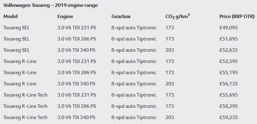 On average, the Touareg V6 TSI returns 31.7 mpg UK (8.9 lt/100 km / 26.4 mpg US) and its CO2 emissions stand at 203 g/km. Despite being 50 kg (110 lbs) lighter than the diesel-powered models, it has an identical towing capability of 3,500 kg (7,716 lbs).