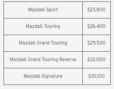 Lastly, the range-topping Mazda6 Signature costs $35,100 and is distinguished by a gunmetal front grille. Bigger changes occur in the cabin as drivers will be greeted by Nappa leather seats, Japanese Sen wood trim and UltraSuede accents. Elsewhere, there’s a frameless rearview mirror, ambient LED lighting and a seven-inch display in the instrument cluster. The model also has GPS navigation, a 360° view monitor and front / rear parking sensors.