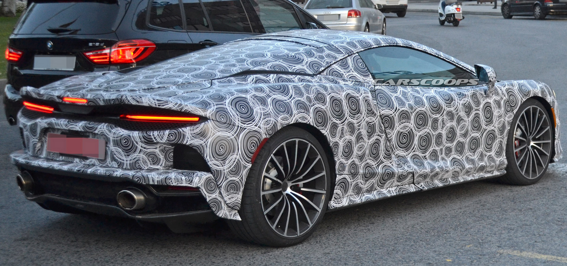 Following a teaser in Geneva last month and then the reveal of a more exposed prototype a few weeks back, we’ve now been given yet another look at McLaren’s upcoming new Grand Tourer, seen here wearing really tight, silhouette-revealing camouflage.