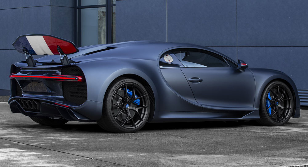 The multi-million dollar hypercar has visible carbon fiber bodywork and aluminum grille and sports the French flag colors on certain parts of the exterior, including the underside of the rear spoiler and side mirror casings. The same colors, which symbolize the ideals of liberty (blue), equality (white) and fraternity (red) – or liberté, égalité, fraternité – adorn the cockpit and can be seen on the headrests and backrests.