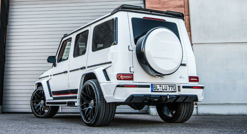 A new body kit makes the latest G-Wagen look more aggressive. It adds front and rear aprons, extended wheel arches, new side skirts, diffuser and raised bonnet air vents. Completing the exterior styling are the spare wheel cover, carbon fiber side mirror caps, rear roof spoiler, front roof panel with four additional lights, and 24-inch rims with a Y-spoke design wrapped in 295/30 and 355/25 front and rear tires, respectively.