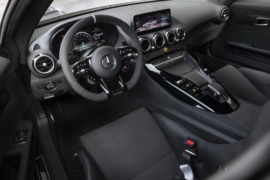 As mentioned, the twin-turbo 4.0-liter V8 engine still produces 577hp (585PS) and 516lb-ft (700Nm) of torque, sending the AMG GTR Pro to 62mph (100km/h) in 3.6 seconds and on to a top speed of 198mph (318km/h).