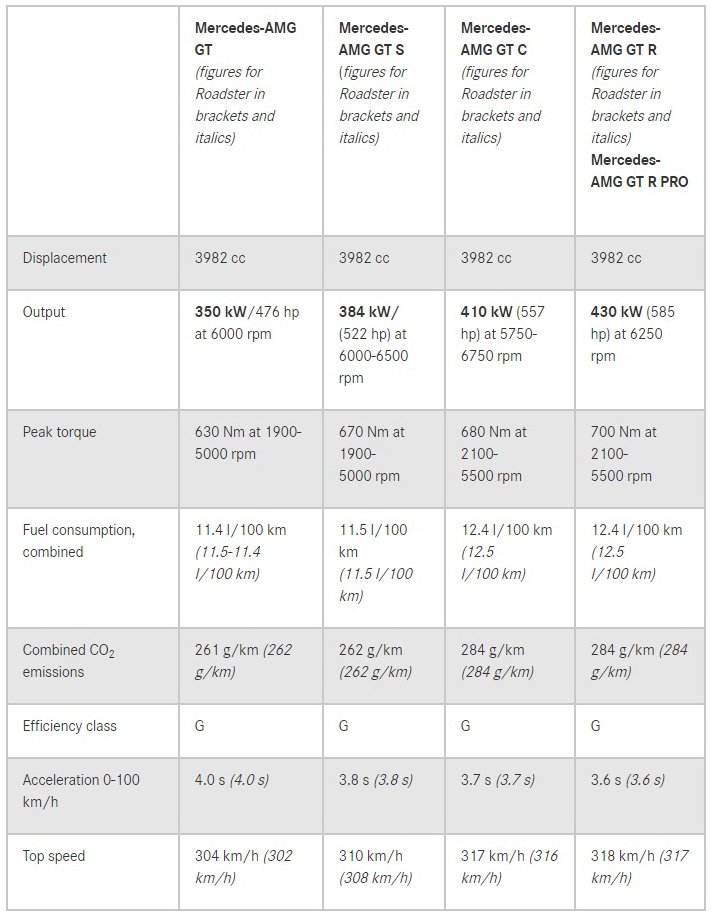 Customers still have no less than four different AMG GT models to choose from, in Coupe and Roadster bodystyles. Base AMG GT models offer 469hp (476PS) and 464lb-ft (630Nm), while the AMG GT S version comes with 515hp (522PS) and 494lb-ft (670Nm). The AMG GT C is the most powerful of the lot this side of the GT R, with 549hp (557PS) and 501lb-ft (680Nm) of torque.
