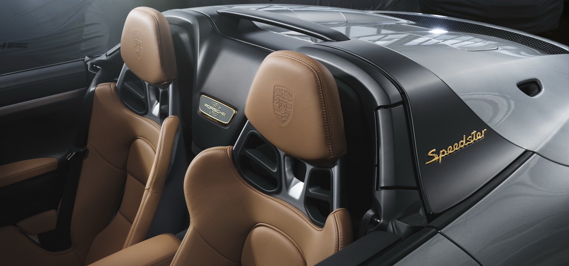 Opt for the Heritage Design Pack and you also gain Platinum Satin 20-inch center lock wheels, with an option to have them painted Silver. The calipers of the standard PCCBs are painted in Black and also come with white ‘Porsche’ lettering. Other exterior touches include the historic Porsche crest on the “frunk” and wheels, as well as ‘Speedster’ model designations in gold at the rear and on the sides of the streamliners.