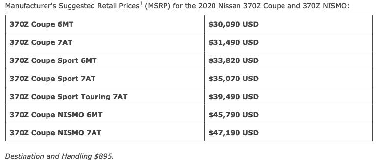 Nissan has released U.S. pricing for the recently-unveiled 2020 370Z 50th Anniversary Edition package as well as the regular 2020 370Z and 2020 370Z Nismo models.