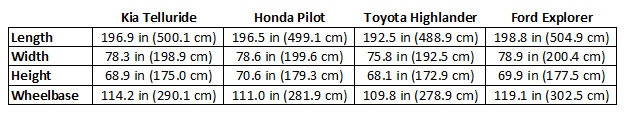 The Telluride and Pilot are pretty evenly matched in terms of exterior dimensions, but Kia’s crossover has a 3.2 inch (8.1 cm) longer wheelbase. The Highlander, on the other hand, is the little guy of the group as it trails the competition in all four categories.