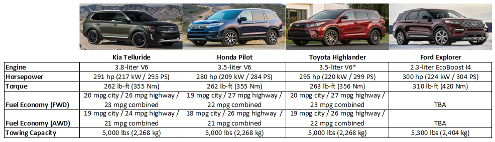 The Telluride certainly has a lot going for it, but it’s far from the only family-friendly crossover on the market. In fact, Kia wants to challenge well established competitors such as the Ford Explorer, Honda Pilot and Toyota Highlander. Those are the segment heavyweights, so we decided to see how they all stack up.