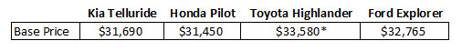 Pricing is a bit complicated. All four offer varying degrees of equipment, but the Pilot is the most affordable, starting at $31,450, barely edging out the Telluride, which has a $31,690 starting price.