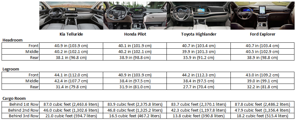 Front seat passengers will probably like the Highlander the best, as it has the most legroom and the second most headroom. The Telluride has a bit less legroom, but a tad more headroom. The Explorer isn’t too far behind, while the Pilot is a distant fourth with just 40.9 inches (103.9 cm) of front seat legroom and 40.1 inches (101.9 cm) of headroom.