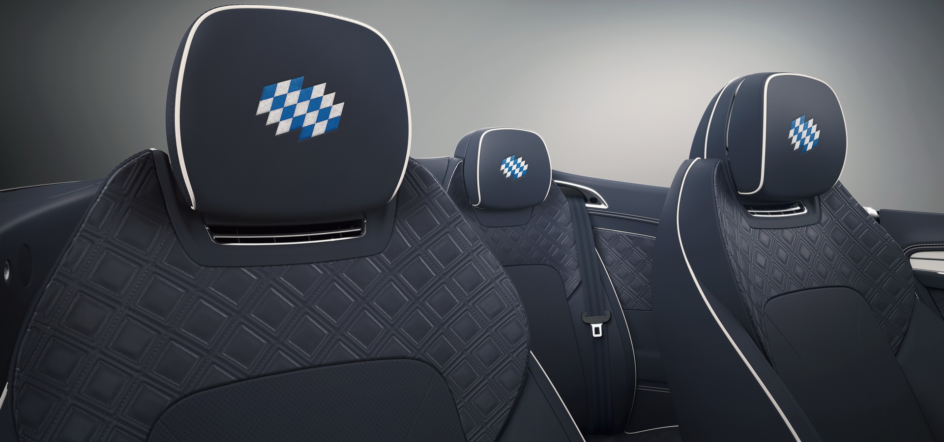 As for the interior, there are Bavarian flag pattern embroidered seat headrests in the same Bespoke White and Light Blue Sport as on the outside, a Bentley Bavaria Edition tread plate inlay, a Mulliner Glacier White painted dual veneer with an Imperial Blue hide, and rounding everything off is the white contrast stitching and piping, which can be found on the seats, door panels, center console, steering wheel and even the floor mats.