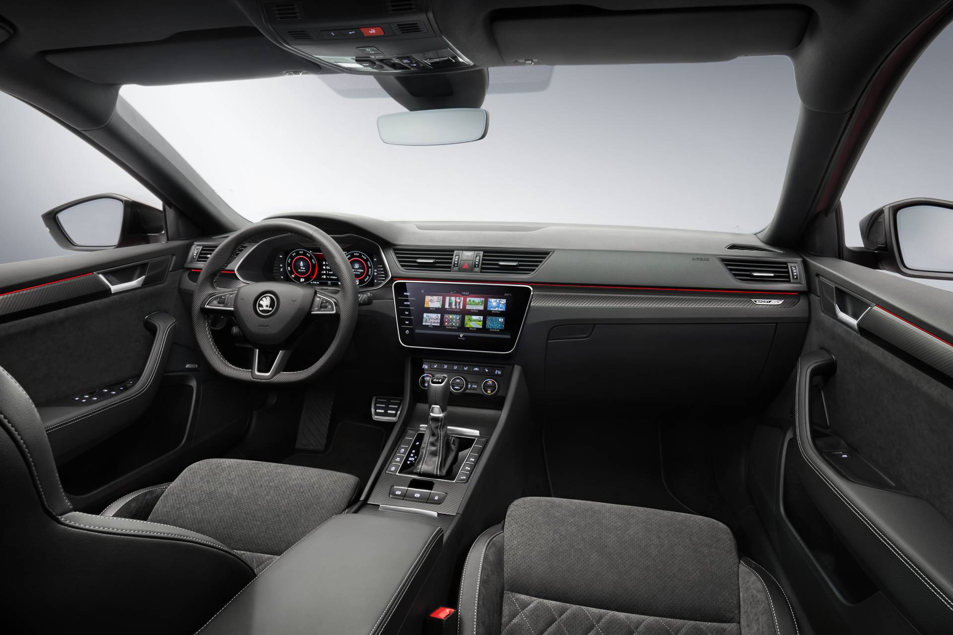 Inside, the facelifted Skoda Superb Sportline is equipped with sports seats wrapped in Alcantara and leather with integrated headrests and contrasting stitching, a three-spoke leather steering wheel, decorative strips in a carbon-effect appearance, and chrome accents. The roof lining and pillars can also be clad in black Alcantara should the customer want to pay for that.