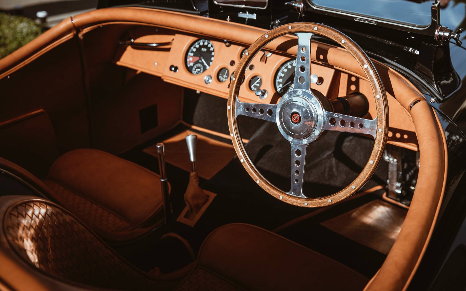 The classic open-top Jag welcomes passengers with an Aged Saddle tan leather interior and seats in a bespoke lattice design with the seat backs in aluminum rather than the original fabric material. The car also features a smaller than normal (15-inch) steering wheel and no battery behind the driver’s made-to-measure seat to free up space for the owner who is 6ft 2in (1.88 m) tall.