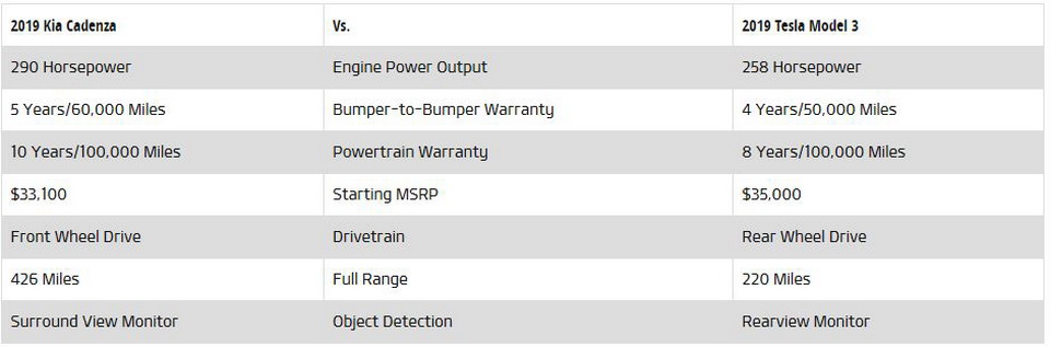 According to Kia of Brandon, buying a 2019 Cadenza sedan is more advantageous than opting for the fully electric Tesla Model 3 – and the dealer even went as far as to (try and) point out why.