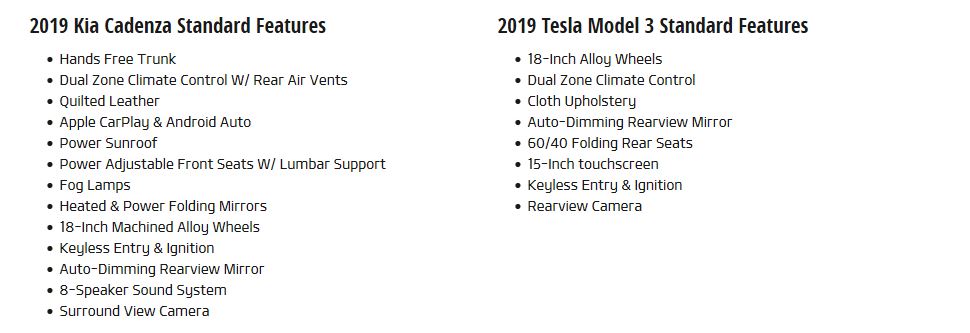 “First introduced in 2017, the Model 3 brings electrification to mainstream. Range anxiety, subpar cargo capacity, and limited features keep it at bay from competitors. Instead consider the 2019 Kia Cadenza, with an array of standard features, ample interior space and an 18.5 gallon tank to keep you on the road for longer.”