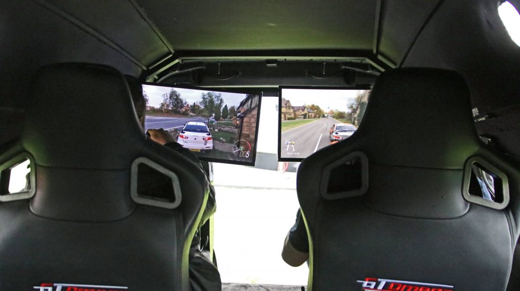 Those include two Logitech G920 Driving Force Racing wheels (each complete with a pedal box and gear shifter), two Xbox One consoles, and the Forza Horizon 4 driving simulator. All of them are accommodated in the now covered pickup bed, which also features two racing seats and two curved 24-inch LED screens. That’s not all: the rear area also includes a coffee machine and refreshment bar.