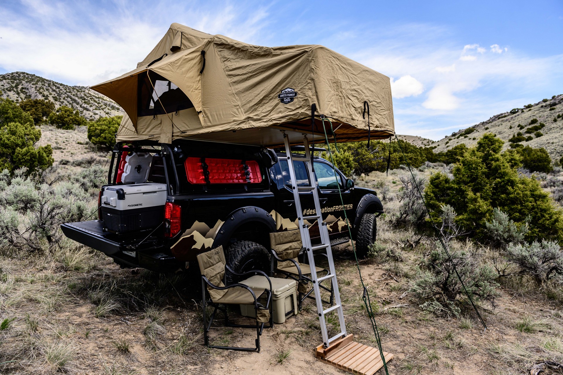 Since the Destination Frontier was designed with camping in mind, the model has a roof-mounted Leitner Designs bed rack and a CVT Mt. Shasta tent. The truck also has a Rhino Rack Pioneer Tray, WeatherTech floor mats and a Dometic refrigerator / freezer. Rounding out the highlights are jerry cans and recovery boards.