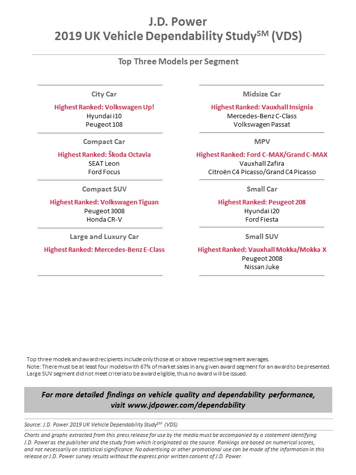 JD Power released the results of its annual 2019 UK Vehicle Dependability study, which measures the number of problems experienced per 100 vehicles in the UK, based on the responses from 11,530 owners of new vehicles registered from November 2015 through January 2018 in the UK.