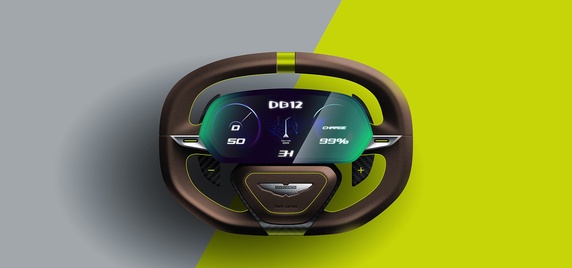 Also interesting is the steering wheel, rendered in multiple colors, including some very distinctive, AMR-like ones. It has three spokes, carbon fiber paddle shifters and a screen on top of the airbag unit acting as a digital gauge cluster.