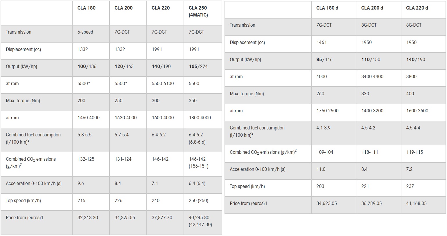 Next in the lineup is the CLA 200, which uses the same engine, albeit with 163 PS (161 hp / 120 kW) and 250 Nm (184 lb-ft) of torque and matched to a 7-speed automatic gearbox. The CLA 220 and CLA 250 4Matic are powered by a 2.0-liter unit, making 190 PS (187 hp / 140 kW) and 300 Nm (221 lb-ft), and 224 PS (221 hp / 165 kW) and 350 Nm (258 lb-ft), respectively, and are available exclusively with a 7-speed DCT.