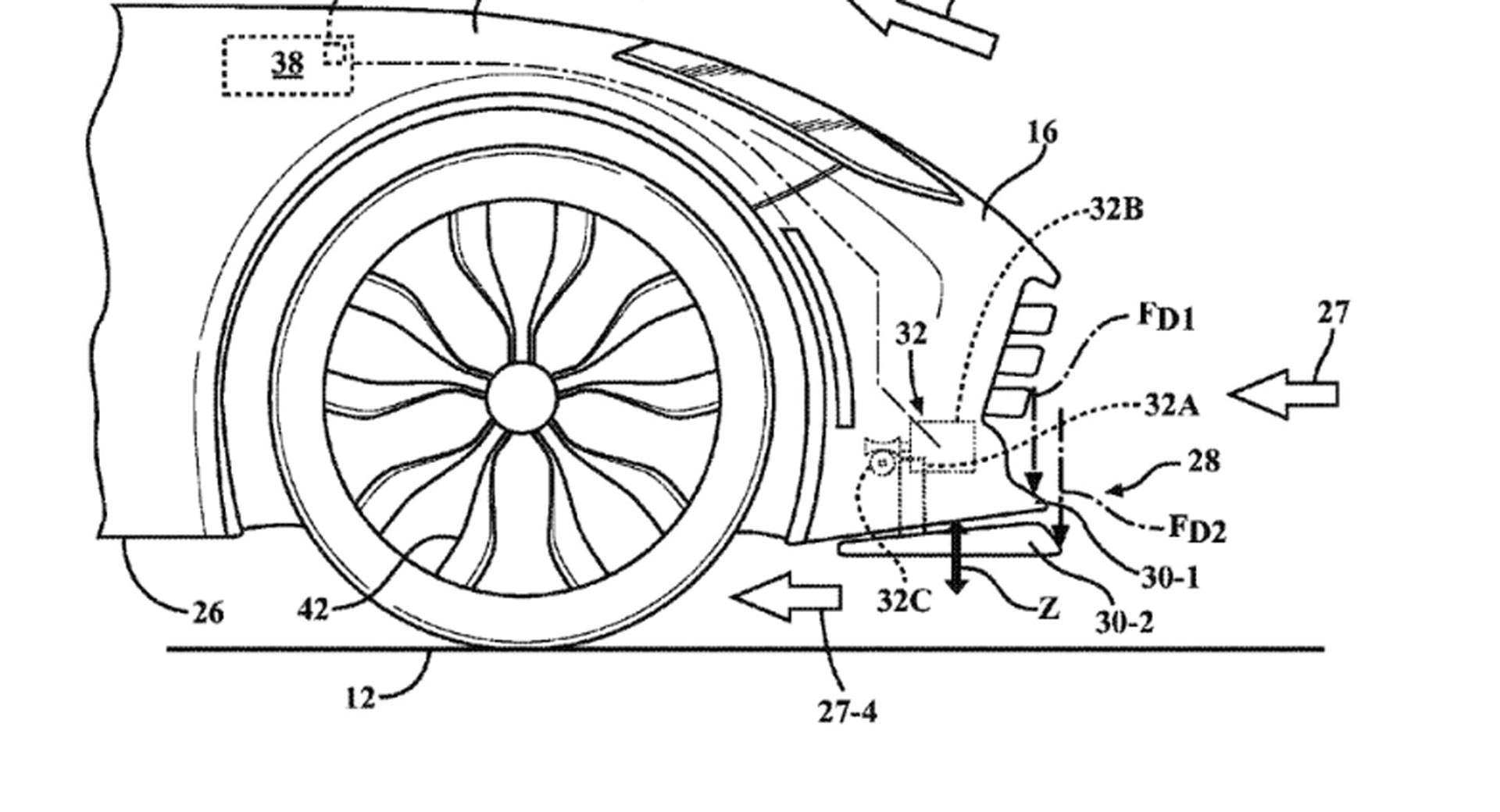 Although we’ve seen similar active aero patents in both 2017 and 2018, this one details “an air deflector moveably mounted to the vehicle body” and includes images revealing “a mechanism configured to selectively vary a height of the air deflector relative to the road surface and a position of the air deflector relative to the vehicle body to thereby control a movement of the ambient airflow relative the vehicle body.”