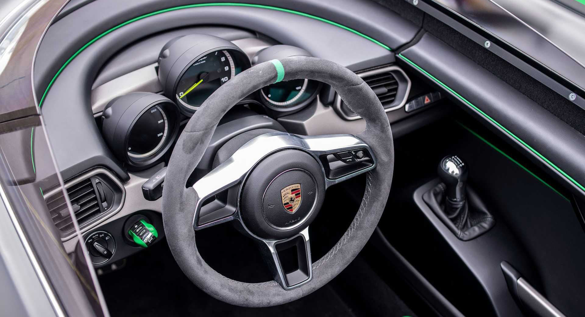 Much like the 909, the Boxster includes a hoop directly behind the head of the driver and a pair of voluptuous buttresses. Porsche also fitted the car with black wheels and green calipers.
