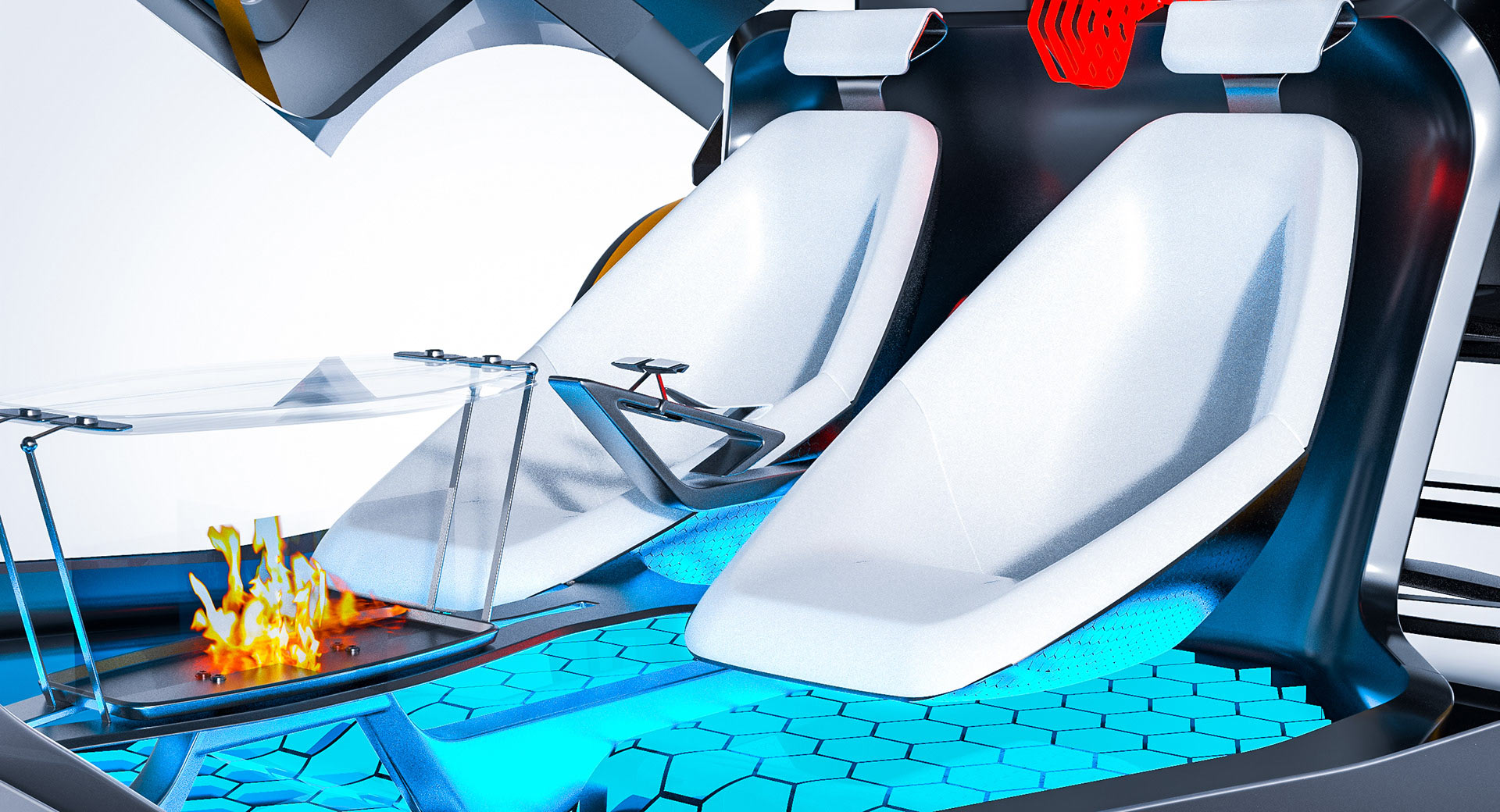 The concept has a four-seat layout with two rows of lounge chairs facing each other. In the center of the cabin is a small electric fireplace while covering the floor are blue LED lights, giving the vehicle a very futuristic vibe and offering us a glimpse as to how interior design could change in the near future.