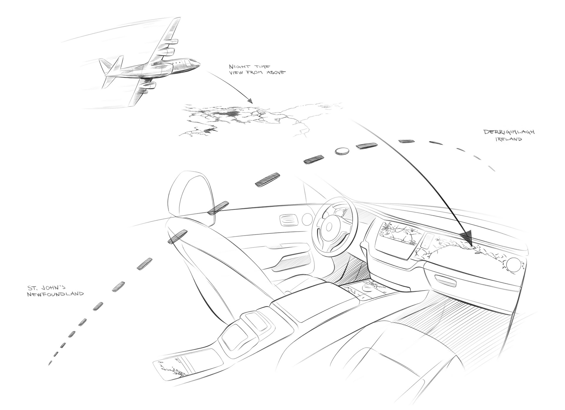 Another sketch shows how the team envisioned providing a so-called “night-time view from above” and projecting that onto the Wraith’s dashboard using silver, gold and copper inlays. This effectively recreates what Captain John Alcock and Lieutenant Arthur Brown would have seen during their nighttime journey.