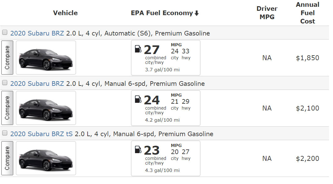 Fuel economy data published online by the EPA lists the two standard automatic and manual 2020 BRZ models and, beneath them, a tS version with a six-speed manual that’s been rated at 20 mpg city / 27 mpg highway, making it slightly thirstier than the regular BRZ.