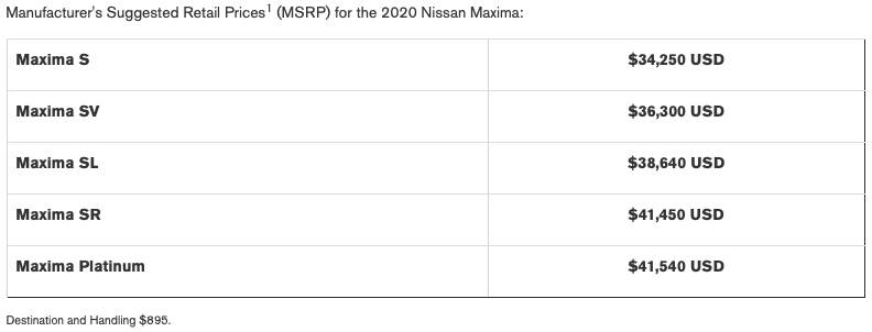 The 2020 Nissan Maxima goes on sale today in the United States with a starting price of $34,250 for the base S trim level, excluding a $895 destination fee.