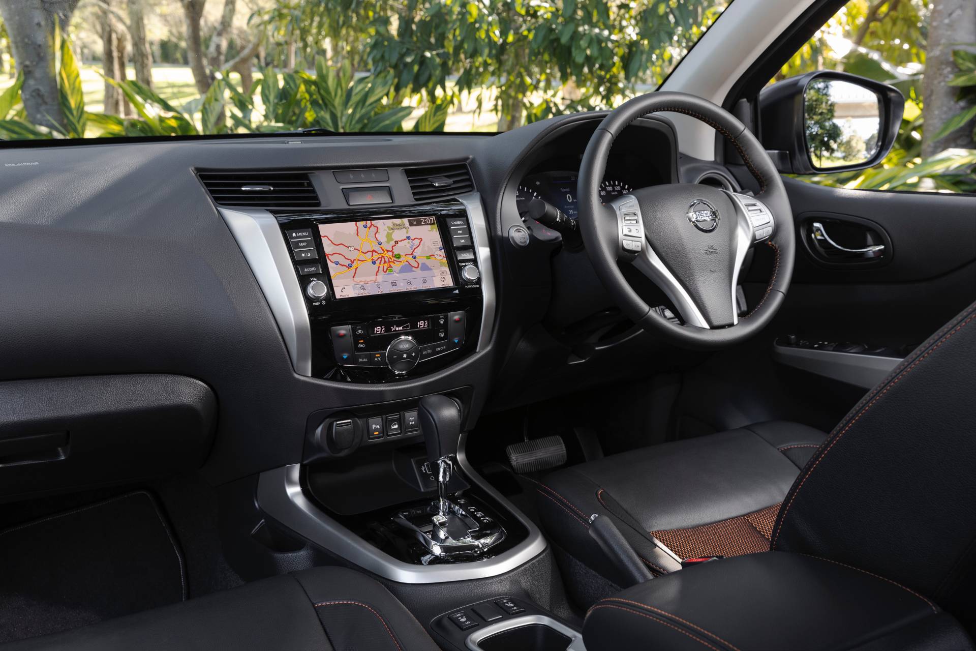 Other distinctive elements are the black LED headlamp bezels, black lower body side decals, and N-Trek tailgate badge. The Nissan Navara N-Trek gets a special treatment inside too consisting of leather seats with orange fabric inserts, orange stitching on the seats, center console, front door armrests and steering wheel, power-adjustable driver’s seat (including lumbar) and heated front seats.