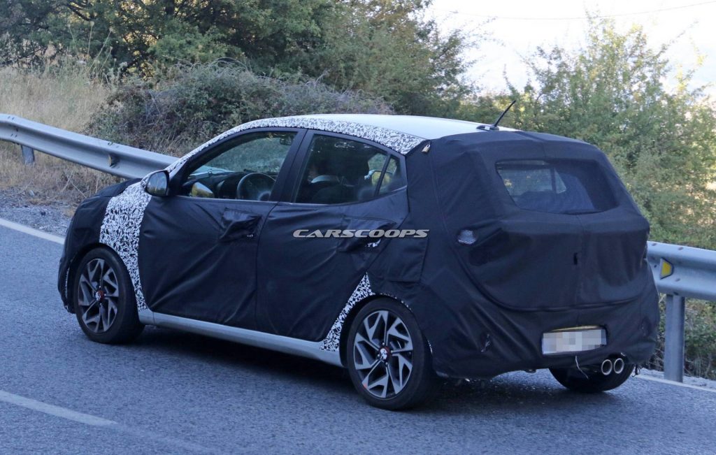 Spied during hot weather testing, this i10 features something never before seen on a 2020 Hyundai i10 prototype: two big round exhaust pipes. A closer look also reveals a sportier looking grille flanked by two round additional lights, big air intakes in the bumper, as well as larger, wider wheels in a sporty design with a red center cap.