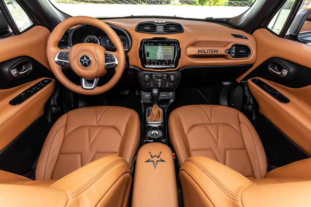 Thanks to the massive 20-inch “Black Edition” Militem alloys shod with knobby tires and a suspension lift kit, the Hero rides 1.5-inch (38 mm) higher than the stock Renegade. Despite that, Militem says the vehicle was not designed solely for off-road use, though it’s really capable off the beaten track given the standard AWD and improved approach, departure and breakover angles. Instead, the company describes the Hero as being built “for everyday use in urban areas.”