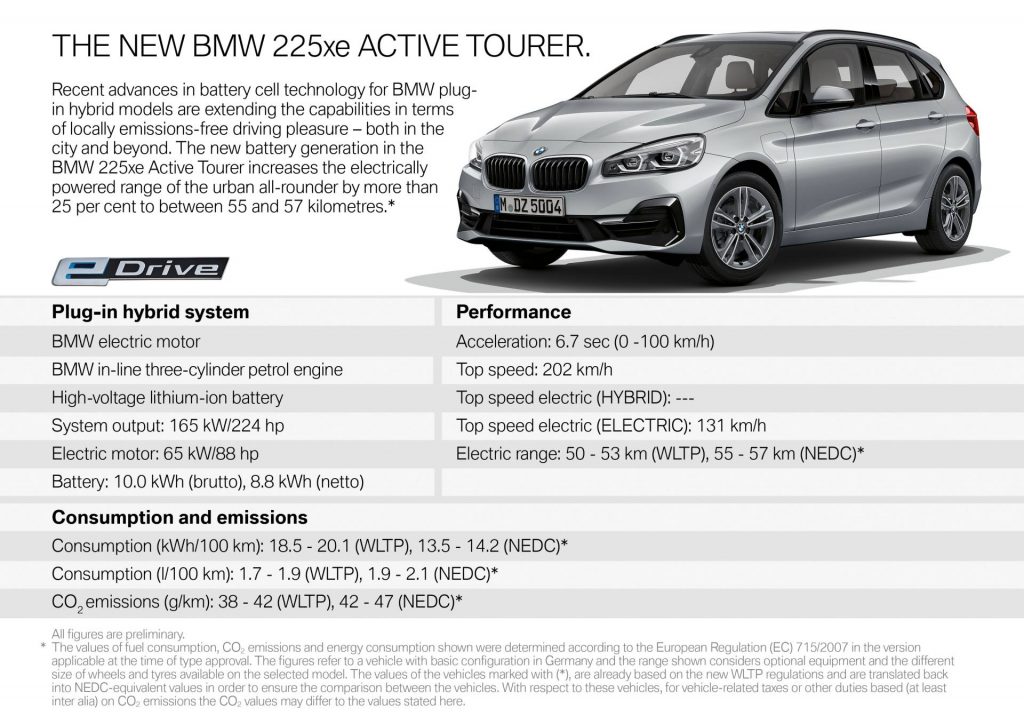 Equipped with the new battery the 225xe Active Tourer can cover between 55 and 57 kilometers (34 – 35 miles) in all-electric mode, which is an increase of 25 percent over the previous version.