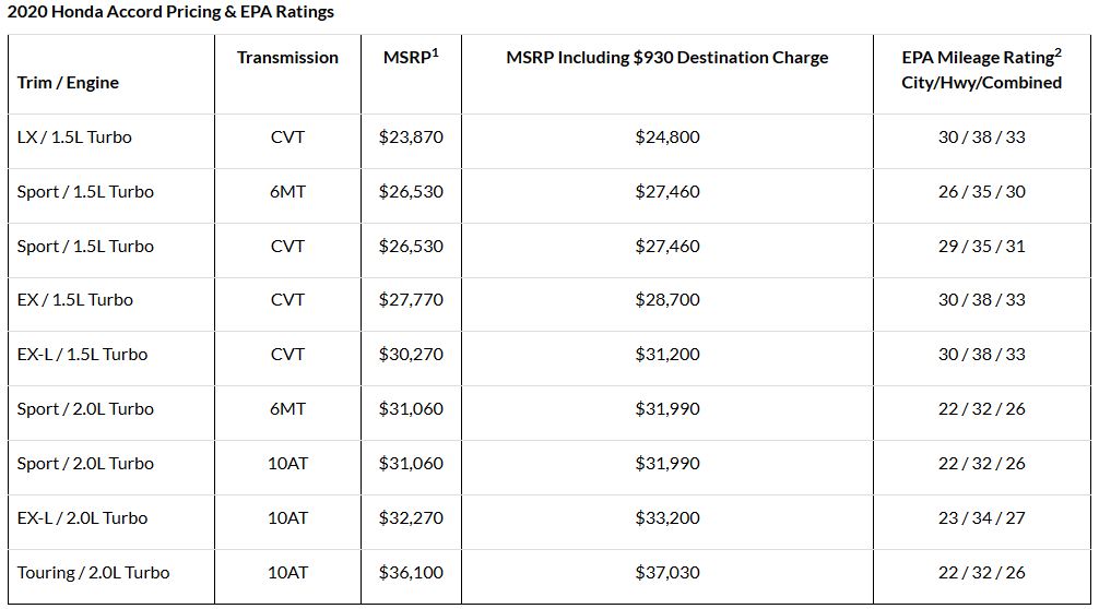 The former can be paired to a CVT automatic transmission or the previously-mentioned manual (six-speed), while the larger engine works alongside a 10-speed automatic – although it too can be had with a manual if you opt for the Sport trim. There are also two exclusive colors available to Sport trim Accord buyers in San Marino Red and Still Night Pearl.